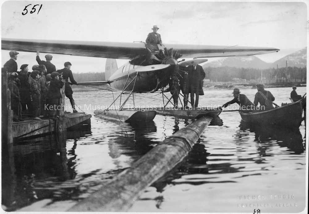 Alaska-Washington Airways Lockheed Vega, “Juneau” NC-432-E arriving in Ketchikan in April 1929. The Pilot Anscel Eckman sits atop the plane. Possibly R. E. Bob Ellis hauling in a mooring line. This aircraft made the first non-stop flight from Seattle to Alaska arriving in Juneau on April 15, 1929 with A. Eckmann as the pilot, Jack Halloran as the mechanic, and Bob Ellis as the navigator. This plane flew in southeast Alaska during the year 1929 and 1930 until April 20, 1930 before the factory deemed the plane beyond repair and scraped it at the factory.