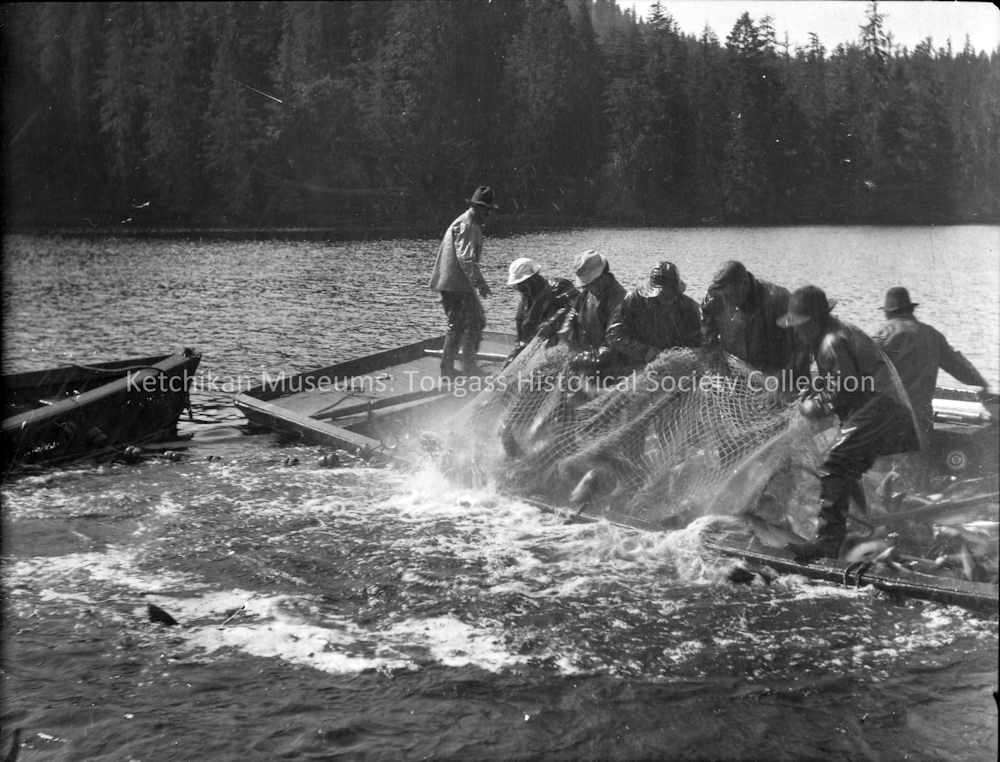 Hand-seiners fishing in Roosevelt Lagoon hauling a net full of salmon into a cannery boat for the Alaska Packer Association cannery at Loring, Alaska during the summer of 1908.